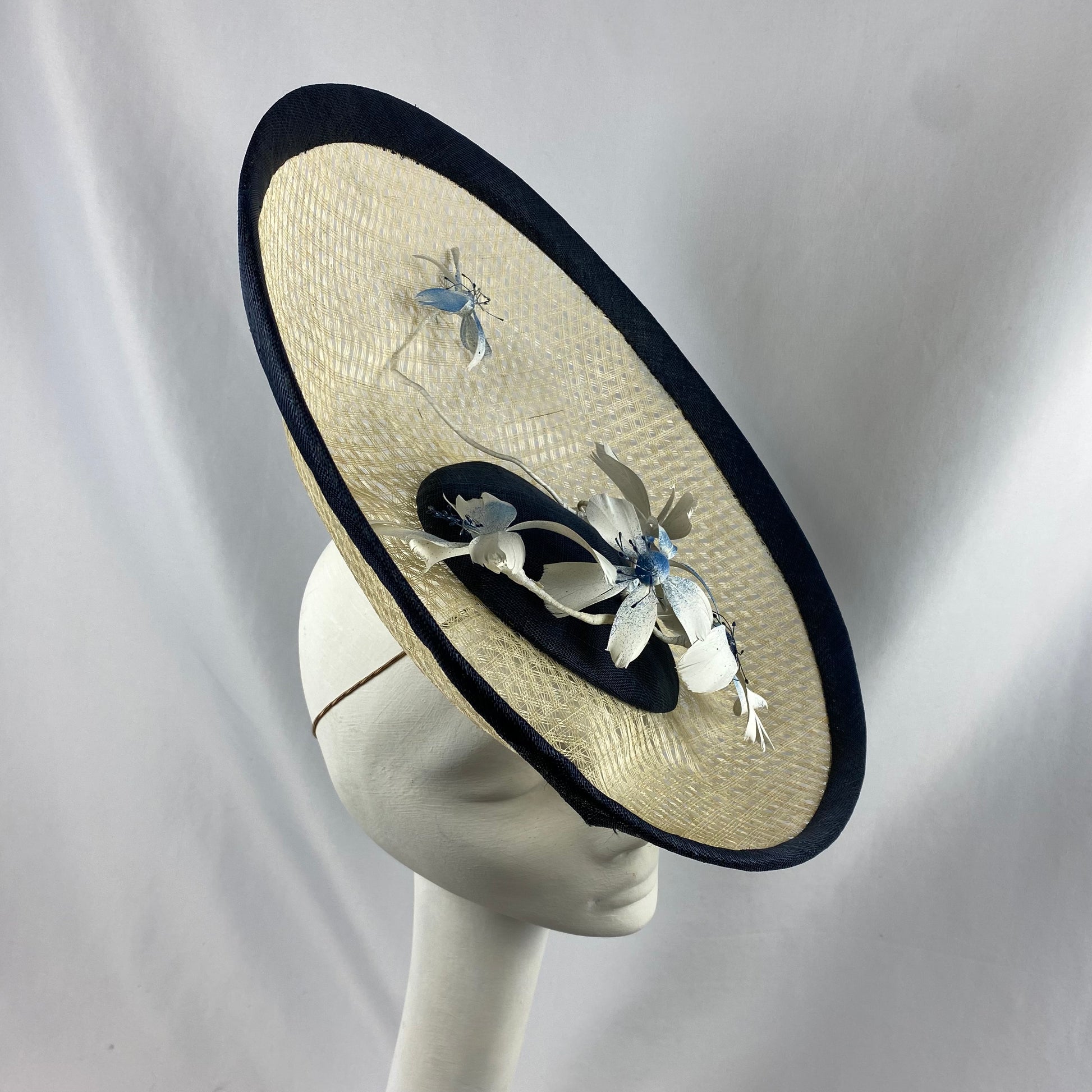 Huge disc hat on a band in open weave straw with delicate flowers twisted in the brim. Made to order in any colour. Held in place with a band and an elastic for extra security.